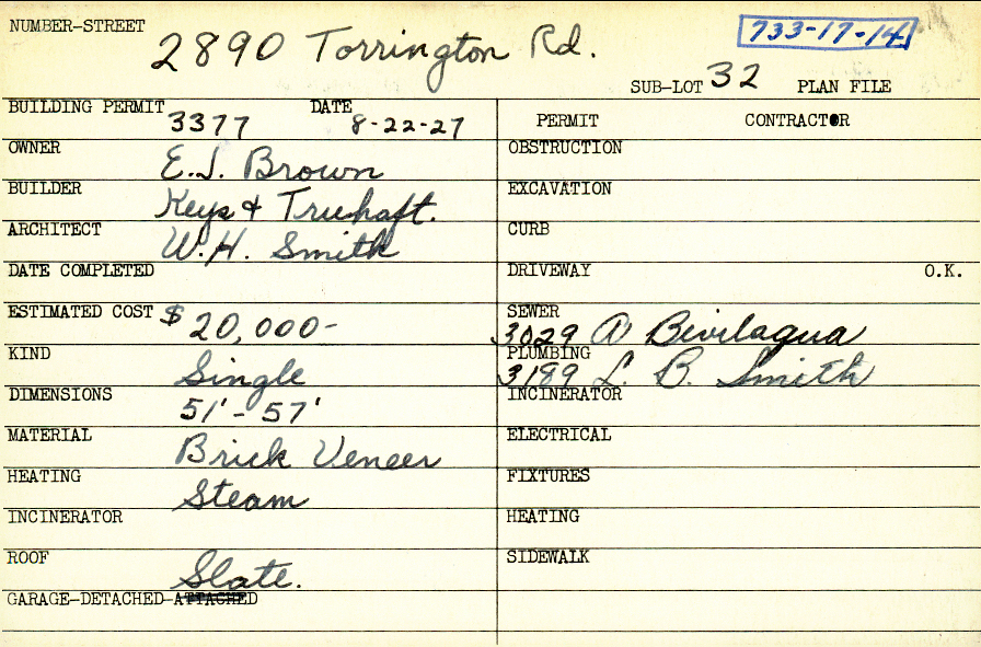 2890 Torrington Road Shaker Heights, OH 44122 PARCEL ID: 733-17-014 Building Permit Date: 08-22-1927 Plan File Number: 0 Neighborhood: Malvern Owner: Brown, E. J. Builder: Keys and Truhaft Architect: Smith, W. H. Estimated Cost: 20000 Kind: Single, Single Residence or Dwelling Material: Brick Veneer Heating: Steam Roof: Slate Garage: detached |