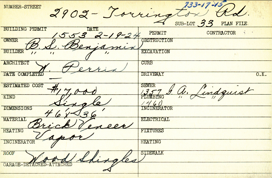 2902 Torrington Road Shaker Heights, OH 44122 PARCEL ID: 733-17-015 Building Permit Date: 02-19-1924 Plan File Number: 5981 Microfilm Roll: Roll#80 Neighborhood: Malvern Owner: Benjamin, B. S. Builder: Benjamin, B. S. Architect: Perrin, William N. Estimated Cost: 17000 Kind: Single, Single Residence or Dwelling Material: Brick Veneer Heating: Vapor Roof: Wood Shingle |
