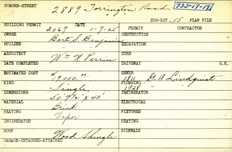 2889 Torrington Road Shaker Heights, OH 44122 PARCEL ID: 733-17-019 Building Permit Date: 01-07-1925 Plan File Number: 3227 Microfilm Roll: Roll#47 Neighborhood: Malvern Owner: Benjamin, Bert S. Builder: Benjamin, Bert S. Architect: Perrin, William N. Estimated Cost: 19000 Kind: Single, Single Residence or Dwelling Material: Brick Heating: Vapor Roof: Wood Shingle |