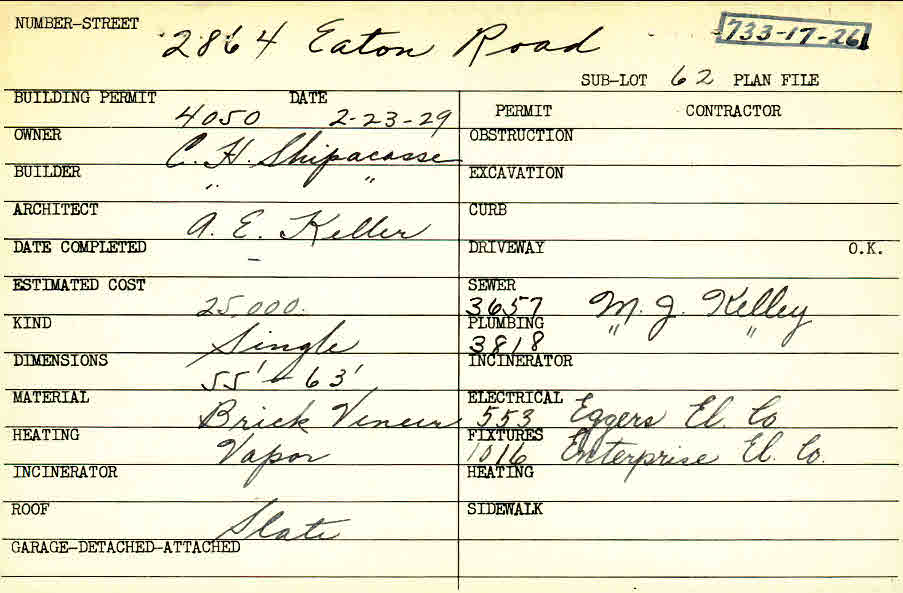 2864 Eaton Road Shaker Heights, OH 44122 PARCEL ID: 733-17-026 Building Permit Date: 02-23-1929 Plan File Number: 9725 Microfilm Roll: Roll#104 Neighborhood: Malvern Owner: Shipacasse, C. H. Builder: Shipacasse, C. H. Architect: Keller, Arthur Emil Estimated Cost: 25000 Kind: Single, Single Residence or Dwelling Material: Brick Veneer Heating: Vapor Roof: Slate |