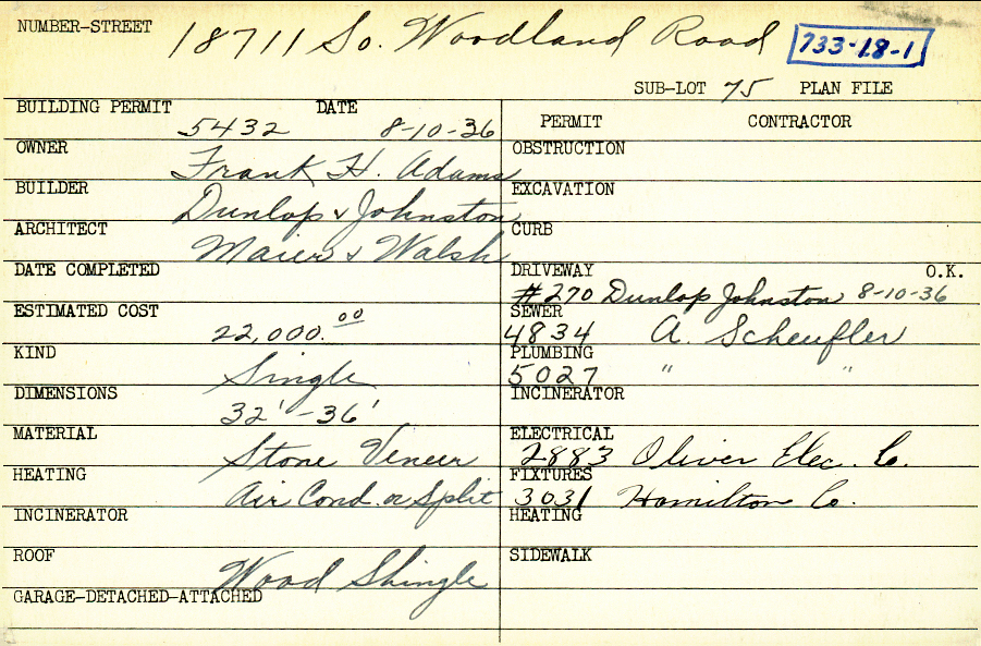 18711 South Woodland Road Shaker Heights, OH 44122 PARCEL ID: 733-18-001 Building Permit Date: 08-10-1936 Plan File Number: 0 Neighborhood: Malvern Owner: Adams, Frank H. Builder: Dunlop and Johnston Architect: Maier and Walsh Estimated Cost: 22000 Kind: Single, Single Residence or Dwelling Material: Stone Veneer Heating: Air Conditioned Roof: Wood Shingle |