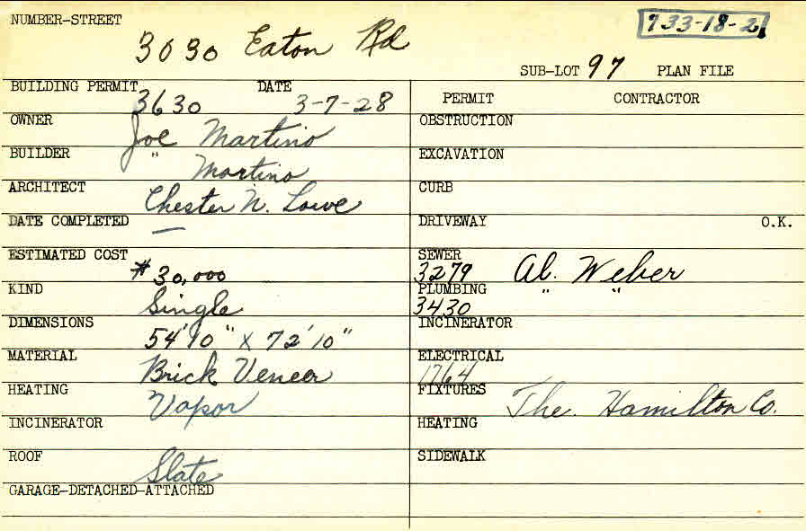 3030 Eaton Road Shaker Heights, OH 44122 PARCEL ID: 733-18-002 Building Permit Date: 03-07-1928 Plan File Number: 0 Neighborhood: Malvern Owner: Martino, Joe Builder: Martino, Joe Architect: Lowe, Chester N. Estimated Cost: 30000 Kind: Single, Single Residence or Dwelling Material: Brick Veneer Heating: Vapor Roof: Slate Card Available: yes |