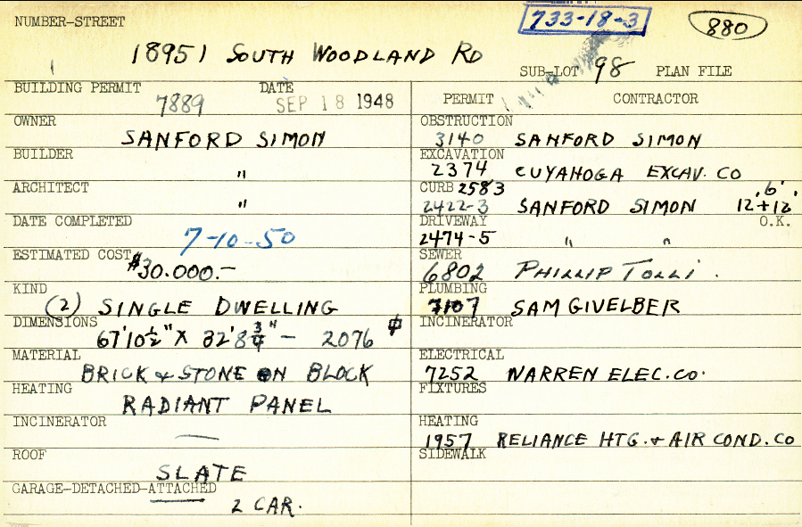 18951 South Woodland Road Shaker Heights, OH 44122 PARCEL ID: 733-18-003 Building Permit Date: 09-18-1948 Plan File Number: 880 all scanned Microfilm Roll: Roll011 Neighborhood: Malvern Owner: Simon, Sanford Builder: Simon, Sanford Architect: Simon, Sanford Estimated Cost: 30000 Date Completed: 07-10-1950 Kind: Single, Single Residence or Dwelling (2) Material: Brick and Stone on Block Heating: Radiant Panel Roof: Slate Garage: attached 2 car Card Available: Yes |