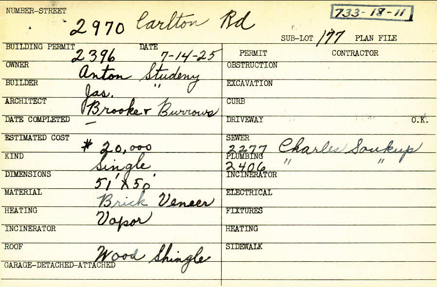 2970 Carlton Road Shaker Heights, OH 44122 PARCEL ID: 733-18-011 Building Permit Date: 07-14-1925 Plan File Number: 2620 all scanned Microfilm Roll: Roll036 Neighborhood: Malvern Owner: Studeny, Anton Builder: Studeny, James Architect: Brooke and Burrows Estimated Cost: 20000 Kind: Single, Single Residence or Dwelling Material: Brick Veneer Heating: Vapor Roof: Wood Shingle Blueprints: online, see link above |