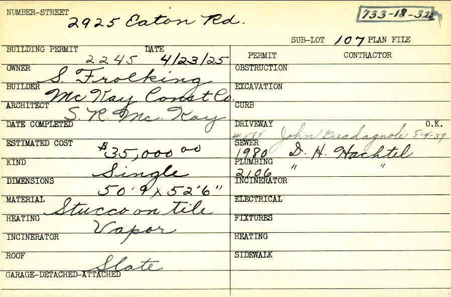 2925 Eaton Road Shaker Heights, OH 44122 PARCEL ID: 733-18-032 Building Permit Date: 04-23-1925 Plan File Number: 5657 Microfilm Roll: Roll#76 Neighborhood: Malvern Owner: Frolking, S. Builder: McKay Construction Company Architect: McKay, S. R. Estimated Cost: 35000 Kind: Single, Single Residence or Dwelling Material: Stucco on Tile Heating: Vapor Roof: Slate |