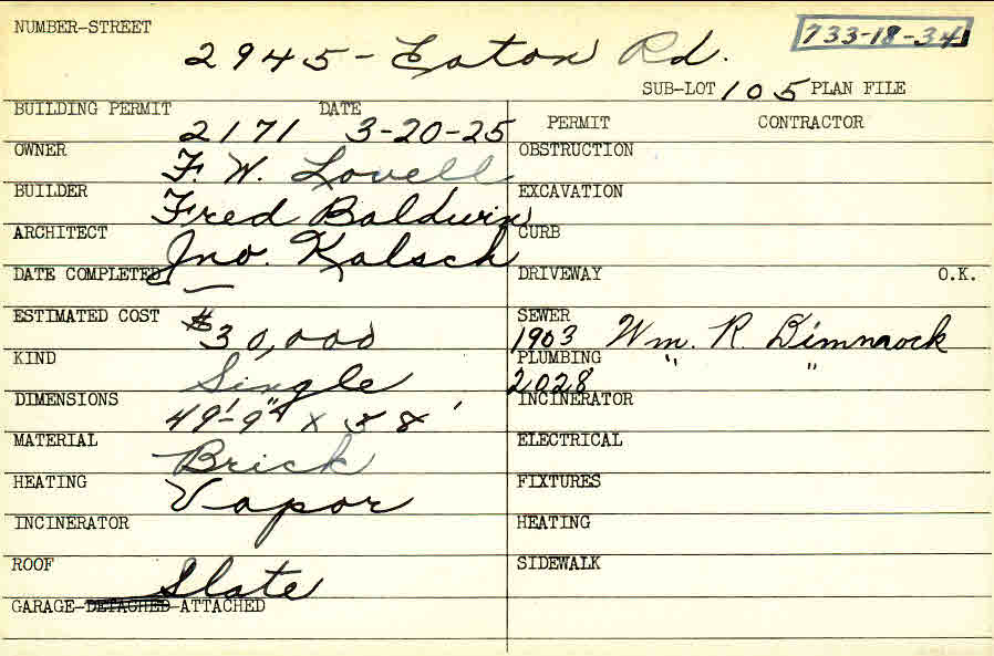 2945 Eaton Road Shaker Heights, OH 44122 PARCEL ID: 733-18-034 Building Permit Date: 03-20-1925 Plan File Number: 0 Neighborhood: Malvern Owner: Lovell, F. W. Builder: Baldwin, Fred Architect: Kalsch, John Estimated Cost: 30000 Kind: Single, Single Residence or Dwelling Material: Brick Heating: Vapor Roof: Slate Garage: attached Card Available: yes |