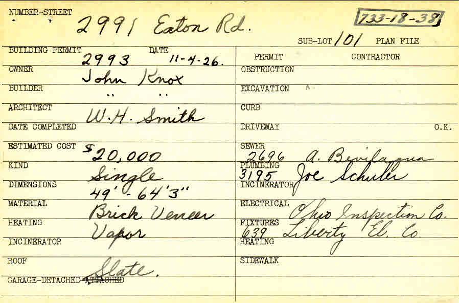 2991 Eaton Road Shaker Heights, OH 44122 PARCEL ID: 733-18-038 Building Permit Date: 11-04-1926 Plan File Number: 8254, 92-116 Microfilm Roll: Roll#97, NewRoll#1 Neighborhood: Malvern Owner: Knox, John Builder: Knox, John Architect: Smith, W. H. Estimated Cost: 20000 Kind: Single, Single Residence or Dwelling Material: Brick Veneer Heating: Vapor Roof: Slate Garage: detached |