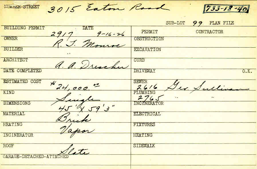 3015 Eaton Road Shaker Heights, OH 44122 PARCEL ID: 733-18-040 Building Permit Date: 09-16-1926 Plan File Number: 0 Neighborhood: Malvern Owner: Monroe, R. J. Builder: Monroe, R. J. Architect: Drescher, A. A. Estimated Cost: 24000 Kind: Single, Single Residence or Dwelling Material: Brick Heating: Vapor Roof: Slate Card Available: yes |