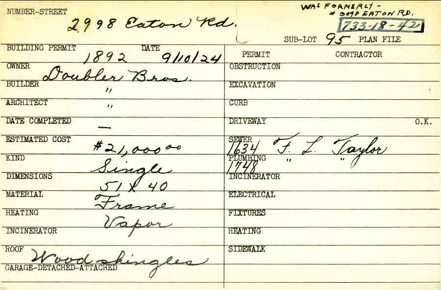 2998 Eaton Road Shaker Heights, OH 44122 PARCEL ID: 733-18-042 Building Permit Date: 09-10-1924 Plan File Number: 0 Neighborhood: Malvern Owner: Doubler Brothers Builder: Doubler Brothers Architect: Doubler Brothers Estimated Cost: 21000 Kind: Single, Single Residence or Dwelling Material: Frame Heating: Vapor Roof: Wood Shingle Card Available: yes |
