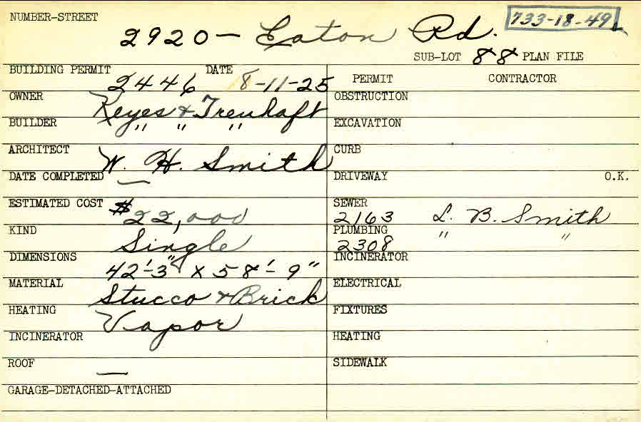 2920 Eaton Road Shaker Heights, OH 44122 PARCEL ID: 733-18-049 Building Permit Date: 08-11-1925 Plan File Number: 0 Neighborhood: Malvern Owner: Keyes and Treuhaft Builder: Keyes and Treuhaft Architect: Smith, W. H. Estimated Cost: 22000 Kind: Single, Single Residence or Dwelling Material: Stucco and Brick Heating: Vapor Card Available: yes |
