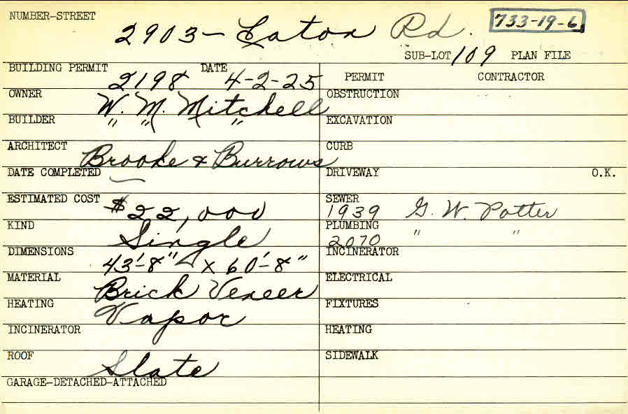 2903 Eaton Road Shaker Heights, OH 44122 PARCEL ID: 733-19-006 Building Permit Date: 04-02-1925 Plan File Number: 0 Neighborhood: Malvern Owner: Mitchell, W. M. Builder: Mitchell, W. M. Architect: Brooke and Burrows Estimated Cost: 22000 Kind: Single, Single Residence or Dwelling Material: Brick Veneer Heating: Vapor Roof: Slate Card Available: yes |