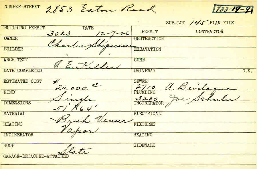 2853 Eaton Road Shaker Heights, OH 44122 PARCEL ID: 733-19-009 Building Permit Date: 12-07-1926 Plan File Number: 0 Neighborhood: Malvern Owner: Shipacasse, Charles Builder: Shipacasse, Charles Architect: Keller, Arthur Emil Estimated Cost: 20000 Kind: Single, Single Residence or Dwelling Material: Brick Veneer Heating: Vapor Roof: Slate |