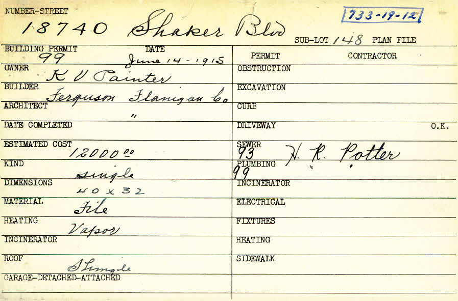 18740 Shaker Boulevard Shaker Heights, OH 44122 PARCEL ID: 733-19-012 Building Permit Date: 06-14-1915 Plan File Number: 11596 Microfilm Roll: NewRoll#8 Neighborhood: Malvern Owner: Painter, K. V. Builder: Ferguson Flanigan Company Architect: Ferguson Flanigan Company Estimated Cost: 12000 Kind: Single, Single Residence or Dwelling Material: Tile Heating: Vapor Roof: Shingles |