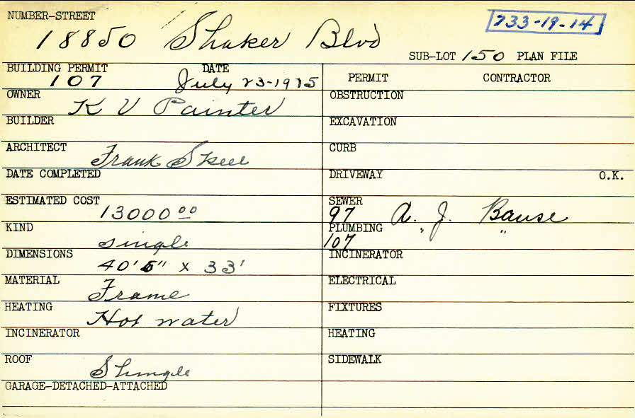 18850 Shaker Boulevard Shaker Heights, OH 44122 PARCEL ID: 733-19-014 Building Permit Date: 07-23-1915 Neighborhood: Malvern Owner: Painter, K. V. Architect: Skeel, Frank Estimated Cost: 13000 Kind: Single, Single Residence or Dwelling Material: Frame Heating: Hot Water Roof: Shingles Blueprints: no blueprints on microfilm |