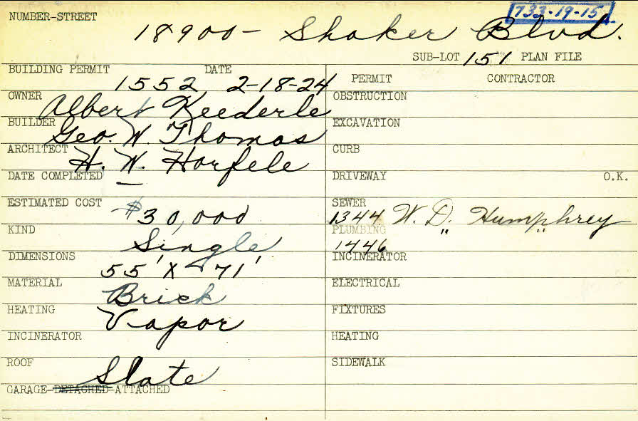18900 Shaker Boulevard Shaker Heights, OH 44122 PARCEL ID: 733-19-015 Building Permit Date: 02-18-1924 Plan File Number: 0 Neighborhood: Malvern Owner: Keederle, Albert Builder: Thomas, George W. Architect: Horfele, H. W. Estimated Cost: 30000 Kind: Single, Single Residence or Dwelling Material: Brick Heating: Vapor Roof: Slate Garage: attached Card Available: yes |