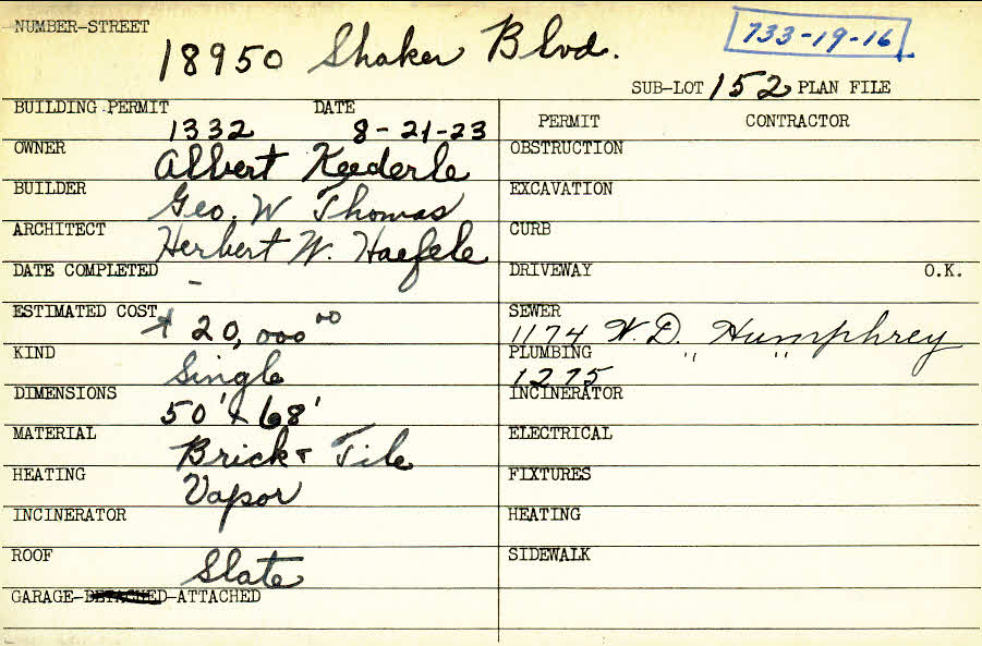 18950 Shaker Boulevard Shaker Heights, OH 44122 PARCEL ID: 733-19-016 Building Permit Date: 08-21-1923 Plan File Number: 5039 Microfilm Roll: Roll#69 Neighborhood: Malvern Owner: Keederle, Albert Builder: Thomas, George W. Architect: Haefele, Herbert W. Estimated Cost: 20000 Kind: Single, Single Residence or Dwelling Material: Brick and Tile Heating: Vapor Roof: Slate Garage: attached |