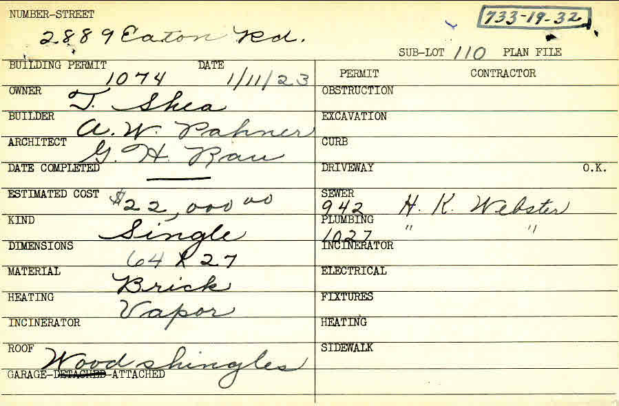 2889 Eaton Road Shaker Heights, OH 44122 PARCEL ID: 733-19-032 Building Permit Date: 01-11-1923 Plan File Number: 5939, 7105, 7521, 12120, 12789 Microfilm Roll: Roll#80, Roll#91, Roll#93, NewRoll#11, NewRoll#15 Neighborhood: Malvern Owner: Pahner, A. W. Builder: Pahner, A. W. Architect: Rau, G. H. Estimated Cost: 22000 Kind: Single, Single Residence or Dwelling Material: Brick Heating: Vapor Roof: Wood Shingle Garage: attached |