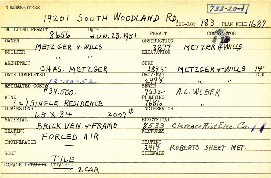 3035 Carlton Road Shaker Heights, OH 44122 PARCEL ID: 733-20-001 Building Permit Date: 06-23-1951 Plan File Number: 1687 all scanned Microfilm Roll: Roll026 Neighborhood: Malvern Owner: Metzger and Wills Builder: Metzger and Wills Architect: Metzger, Charles Estimated Cost: 34500 Date Completed: 12-30-1952 Kind: Single, Single Residence or Dwelling (2) Material: Brick Veneer and Frame Heating: Forced Air Roof: Tile Garage: attached 2 car Card Available: Yes |