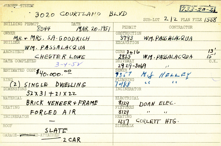 3020 Courtland Boulevard Shaker Heights, OH 44122 PARCEL ID: 733-20-002 Building Permit Date: 03-20-1951 Plan File Number: 1558 scanned, 5135 Microfilm Roll: Roll024, Roll#70 Neighborhood: Malvern Owner: Goodrich, Mr. and Mrs. S.A. Builder: Passalacqua, Wm. Architect: Lowe, Chester Estimated Cost: 40000 Date Completed: 03-05-1952 Kind: Single, Single Residence or Dwelling (2) Material: Brick Veneer and Frame Heating: Forced Air Roof: Slate Garage: attached 2 car Card Available: Yes |