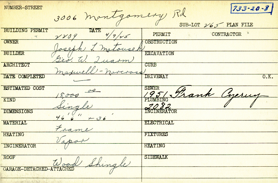 3006 Montgomery Road Shaker Heights, OH 44122 PARCEL ID: 733-20-008 Building Permit Date: 04-07-1925 Plan File Number: 10483 Microfilm Roll: NewRoll#4 Neighborhood: Malvern Owner: Matousek, Joseph L. Builder: Quarm, George W. Architect: Maxwell - Norcross Estimated Cost: 18000 Kind: Single, Single Residence or Dwelling Material: Frame Heating: Vapor Roof: Wood Shingle |