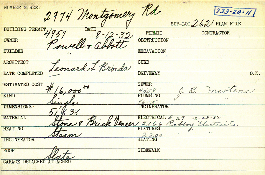 2974 Montgomery Road Shaker Heights, OH 44122 PARCEL ID: 733-20-011 Building Permit Date: 08-12-1932 Plan File Number: 0 Neighborhood: Malvern Owner: Powell and Abbott Builder: Powell and Abbott Architect: Broida, Leonard L. Estimated Cost: 16000 Kind: Single, Single Residence or Dwelling Material: Stone and Brick Veneer Heating: Steam Roof: Slate Card Available: yes |