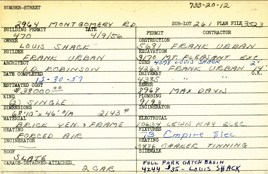 2964 Montgomery Road Shaker Heights, OH 44122 PARCEL ID: 733-20-012 Building Permit Date: 04-09-1956 Plan File Number: 3523 Microfilm Roll: Roll#51 Neighborhood: Malvern Owner: Shack, Louis Builder: Urban, Frank Architect: Robinson, I. D. Estimated Cost: 38000 Date Completed: 12-30-1957 Kind: Single, Single Residence or Dwelling (2) Material: Brick Veneer and Frame Heating: Forced Air Roof: Slate Garage: attached 2 car |