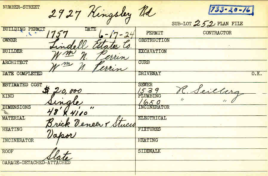 2927 Kingsley Road Shaker Heights, OH 44122 PARCEL ID: 733-20-016 Building Permit Date: 06-17-1924 Plan File Number: 10998 Microfilm Roll: NewRoll#3, NewRoll#6 Neighborhood: Malvern Owner: Lindell Estates Company Builder: Perrin, William N. Architect: Perrin, William N. Estimated Cost: 20000 Kind: Single, Single Residence or Dwelling Material: Brick Veneer and Stucco Heating: Vapor Roof: Slate |
