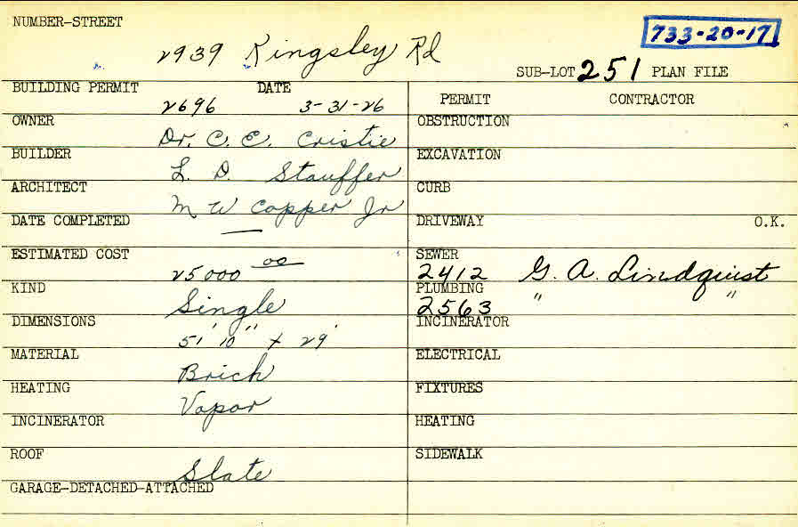2939 Kingsley Road Shaker Heights, OH 44122 PARCEL ID: 733-20-017 Building Permit Date: 03-31-1926 Plan File Number: 10620 all scanned Microfilm Roll: NewRoll05 Neighborhood: Malvern Owner: Cristie, Dr. C. E. Builder: Stauffer, L. D. Architect: Copper, Munroe Walker Jr. Estimated Cost: 25000 Kind: Single, Single Residence or Dwelling Material: Brick Heating: Vapor Roof: Slate Blueprints: online, see link above |