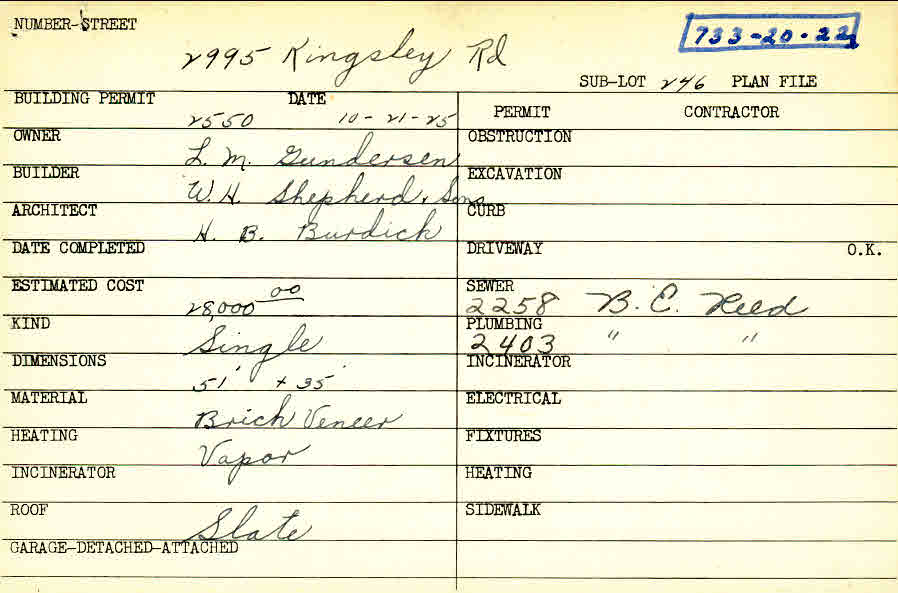2995 Kingsley Road Shaker Heights, OH 44122 PARCEL ID: 733-20-022 Building Permit Date: 10-21-1925 Plan File Number: 11752 Microfilm Roll: NewRoll#9 Neighborhood: Malvern Owner: Gundersen, L. M. Builder: W. H. Shepherd and Sons Architect: Burdick, H. B. Estimated Cost: 28000 Kind: Single, Single Residence or Dwelling Material: Brick Veneer Heating: Vapor Roof: Slate |