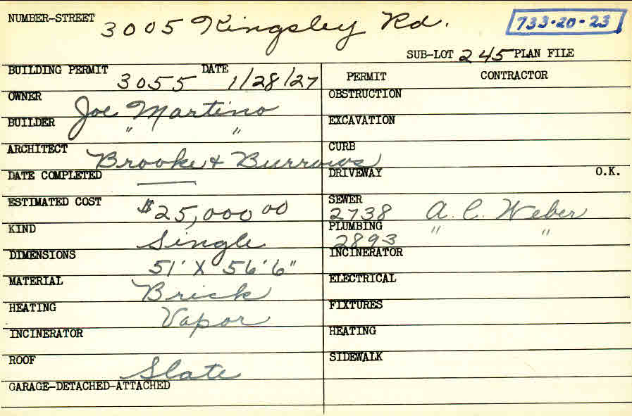 3005 Kingsley Road Shaker Heights, OH 44122 PARCEL ID: 733-20-023 Building Permit Date: 01-28-1927 Plan File Number: 793 all scanned Microfilm Roll: Roll011 Neighborhood: Malvern Owner: Martino, Joe Builder: Martino, Joe Architect: Brooke and Burrows Estimated Cost: 25000 Kind: Single, Single Residence or Dwelling Material: Brick Heating: Vapor Roof: Slate |