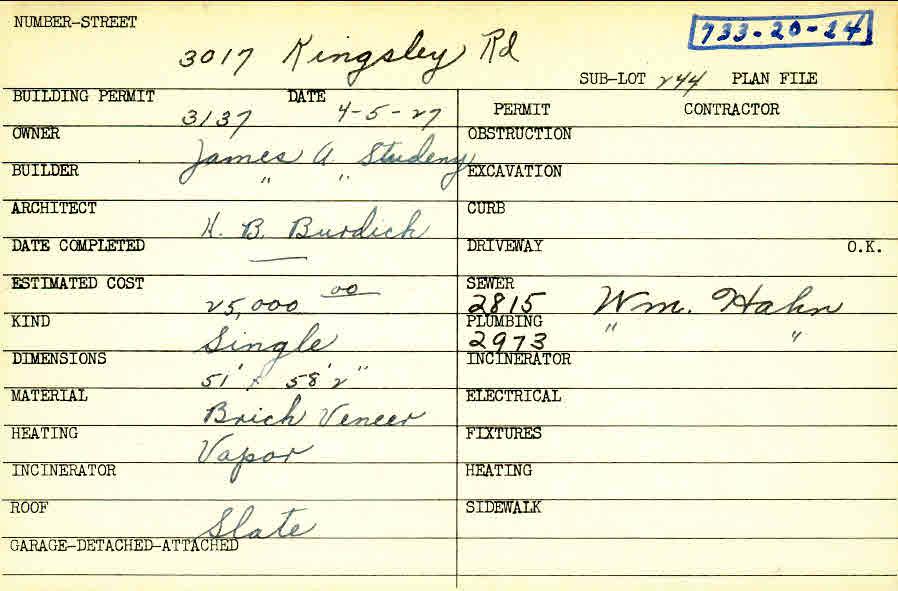 3017 Kingsley Road Shaker Heights, OH 44122 PARCEL ID: 733-20-024 Building Permit Date: 04-05-1927 Plan File Number: 0 Neighborhood: Malvern Owner: Studeny, James A. Builder: Studeny, James A. Architect: Burdick, H. B. Estimated Cost: 25000 Kind: Single, Single Residence or Dwelling Material: Brick Veneer Heating: Vapor Roof: Slate Card Available: yes |