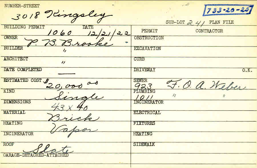 3018 Kingsley Road Shaker Heights, OH 44122 PARCEL ID: 733-20-025 Building Permit Date: 12-21-1922 Plan File Number: 0 Neighborhood: Malvern Owner: Brooke, P. B. Builder: Brooke, P. B. Architect: Brooke, P. B. Estimated Cost: 20000 Kind: Single, Single Residence or Dwelling Material: Brick Heating: Vapor Roof: Slate Card Available: yes |