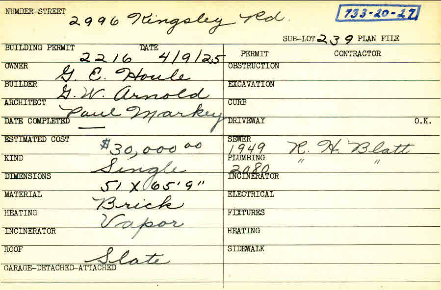 2996 Kingsley Road Shaker Heights, OH 44122 PARCEL ID: 733-20-027 Building Permit Date: 04-09-1925 Plan File Number: 0 Neighborhood: Malvern Owner: Houle, G. E. Builder: Arnold, G. W. Architect: Markey, Paul Estimated Cost: 30000 Kind: Single, Single Residence or Dwelling Material: Brick Heating: Vapor Roof: Slate Card Available: yes |