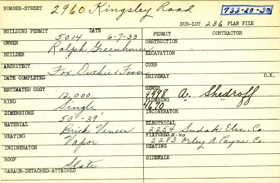 2960 Kingsley Road Shaker Heights, OH 44122 PARCEL ID: 733-20-030 Building Permit Date: 06-07-1933 Plan File Number: 11938 Microfilm Roll: NewRoll#10 Neighborhood: Malvern Owner: Greenhouse, Ralph Builder: Greenhouse, Ralph Architect: Fox, Duthie and Foose Estimated Cost: 12000 Kind: Single, Single Residence or Dwelling Material: Brick Veneer Heating: Vapor Roof: Slate |