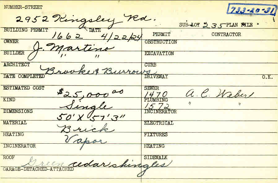 2952 Kingsley Road Shaker Heights, OH 44122 PARCEL ID: 733-20-031 Building Permit Date: 04-22-1924 Plan File Number: 0 Neighborhood: Malvern Owner: Martino, J. Builder: Martino, J. Architect: Brooke and Burrows Estimated Cost: 25000 Kind: Single, Single Residence or Dwelling Material: Brick Heating: Vapor Roof: Shingles Card Available: yes |