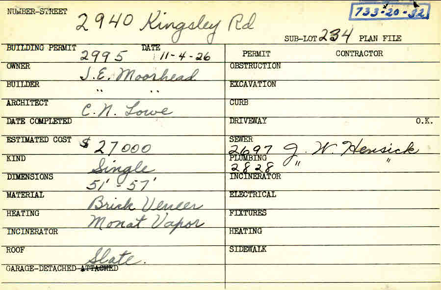 2940 Kingsley Road Shaker Heights, OH 44122 PARCEL ID: 733-20-032 Building Permit Date: 11-04-1926 Plan File Number: 7842 Microfilm Roll: Roll#94 Neighborhood: Malvern Owner: Moorhead, J. E. Builder: Moorhead, J. E. Architect: Lowe, C. N. Estimated Cost: 27000 Kind: Single, Single Residence or Dwelling Material: Brick Veneer Heating: Vapor Roof: Slate Garage: detached |