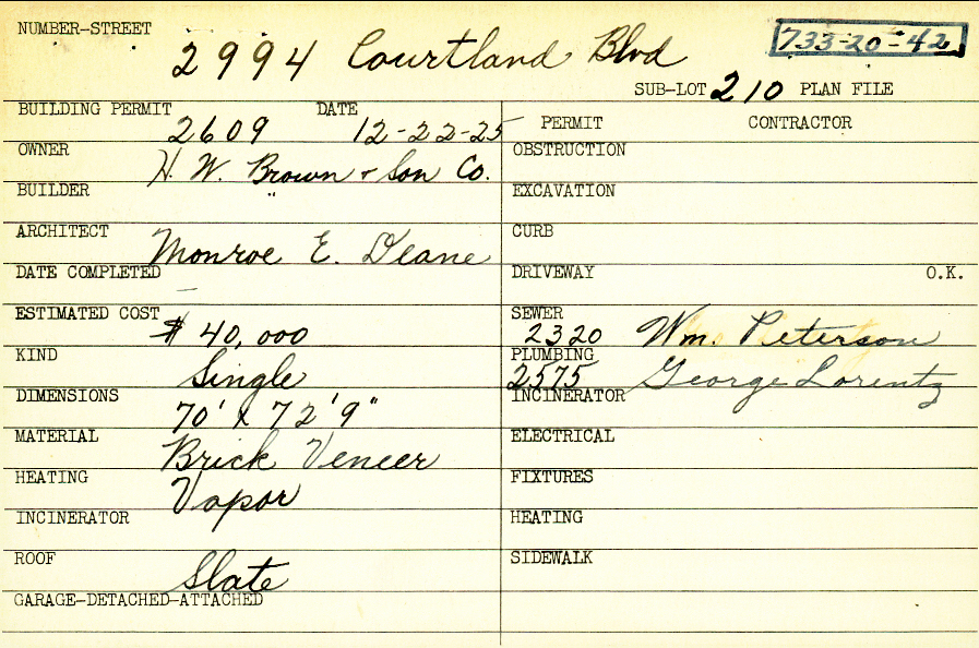 2994 Courtland Boulevard Shaker Heights, OH 44122 PARCEL ID: 733-20-042 Building Permit Date: 12-22-1925 Plan File Number: 10844 Microfilm Roll: NewRoll#6 Neighborhood: Malvern Owner: H. W. Brown and Son Company Builder: H. W. Brown and Son. Company Architect: Deane, Monroe Ensign Estimated Cost: 40000 Kind: Single, Single Residence or Dwelling Material: Brick Veneer Heating: Vapor Roof: Slate |