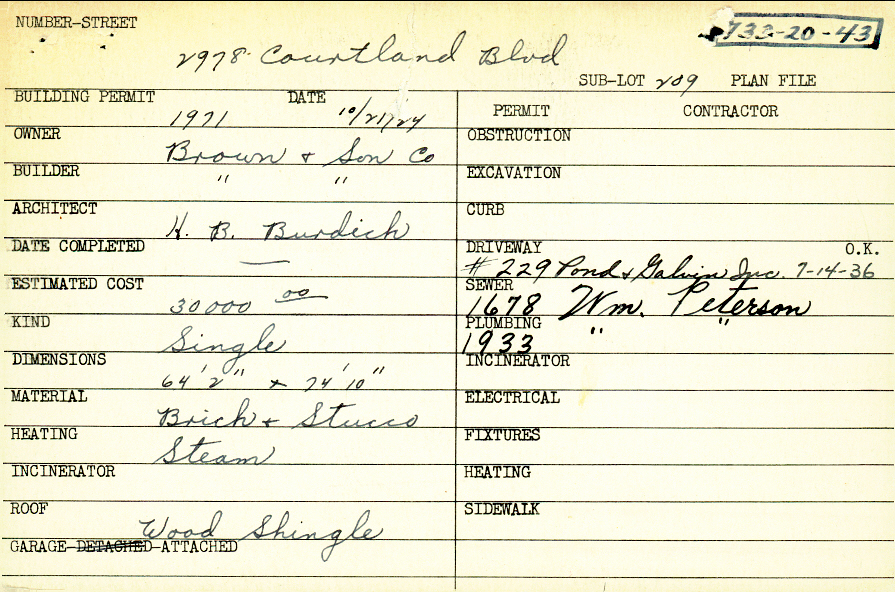 2978 Courtland Boulevard Shaker Heights, OH 44122 PARCEL ID: 733-20-043 Building Permit Date: 10-21-1924 Plan File Number: 0 Neighborhood: Malvern Owner: Brown and Son Company Builder: Brown and Son Company Architect: Burdick, H. B. Estimated Cost: 30000 Kind: Single, Single Residence or Dwelling Material: Brick ans Stucco Heating: Steam Roof: Wood Shingle Garage: attached |