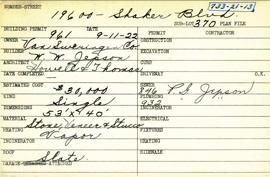 19600 Shaker Boulevard Shaker Heights, OH 44122 PARCEL ID: 733-21-013 Building Permit Date: 09-11-1922 Plan File Number: 0 Neighborhood: Malvern Owner: Van Sweringen Company Builder: Jepson, W. W. Architect: Howell and Thomas Estimated Cost: 30000 Kind: Single, Single Residence or Dwelling Material: Stone, Veneer and Stucco Heating: Vapor Roof: Slate Garage: attached Card Available: yes |