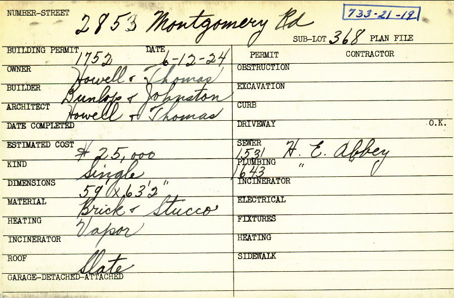 2853 Montgomery Road Shaker Heights, OH 44122 PARCEL ID: 733-21-019 Building Permit Date: 06-12-1924 Plan File Number: 0 Neighborhood: Malvern Owner: Howell and Thomas Builder: Dunlop and Johnston Architect: Howell and Thomas Estimated Cost: 25000 Kind: Single, Single Residence or Dwelling Material: Brick and Stucco Heating: Vapor Roof: Slate Card Available: yes |