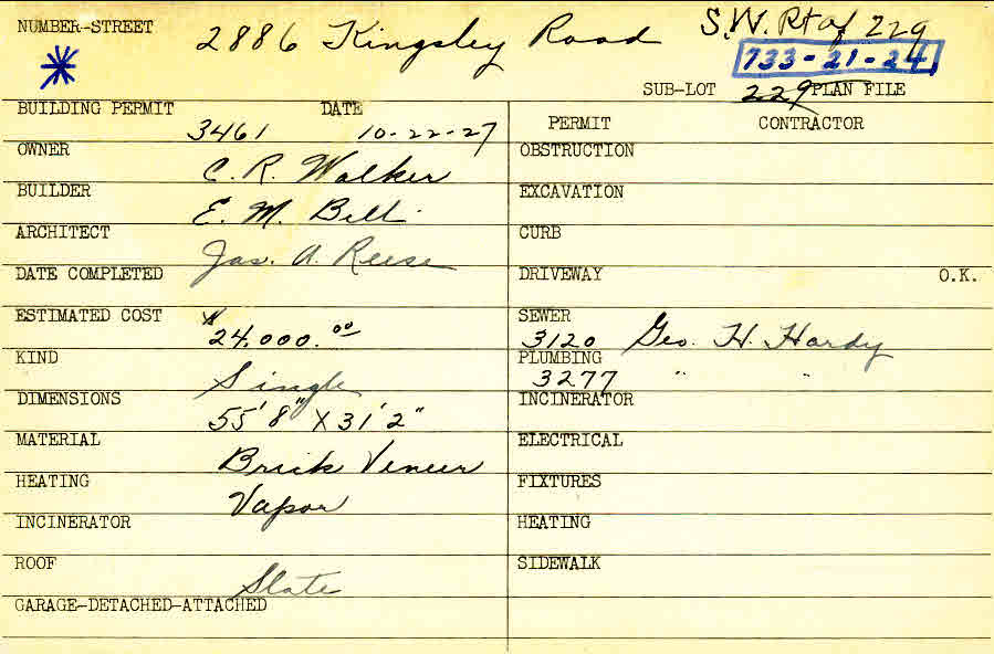 2886 Kingsley Road Shaker Heights, OH 44122 PARCEL ID: 733-21-024 Building Permit Date: 10-22-1927 Plan File Number: 6046 scanned Microfilm Roll: Roll#80 Neighborhood: Malvern Owner: Walker, C. R. Builder: Bell, E. M. Architect: Reese, James A. Estimated Cost: 24000 Kind: Single, Single Residence or Dwelling Material: Brick Veneer Heating: Vapor Roof: Slate |