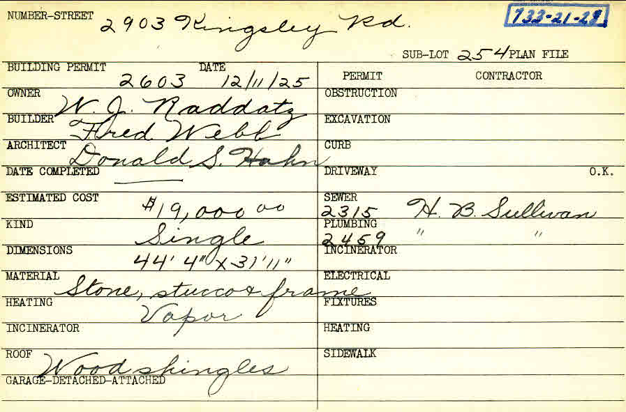 2903 Kingsley Road Shaker Heights, OH 44122 PARCEL ID: 733-21-028 Building Permit Date: 12-11-1925 Plan File Number: 0 Neighborhood: Malvern Owner: Raddatz, W. J. Builder: Webb, Fred Architect: Hahn, Donald S. Estimated Cost: 19000 Kind: Single, Single Residence or Dwelling Material: Stone, Stucco and Frame Heating: Vapor Roof: Wood Shingle Card Available: yes |