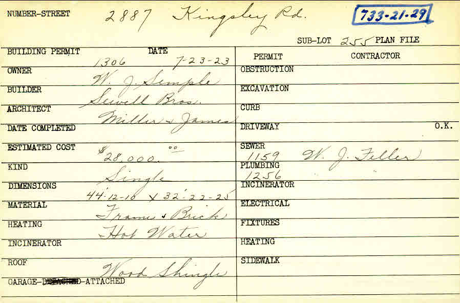 2887 Kingsley Road Shaker Heights, OH 44122 PARCEL ID: 733-21-029 Building Permit Date: 07-23-1923 Plan File Number: 0 Neighborhood: Malvern Owner: Simple, W. J. Builder: Sewell Brothers Architect: Miller and James Estimated Cost: 28000 Kind: Single, Single Residence or Dwelling Material: Frame and Brick Heating: Hot Water Roof: Wood Shingle Garage: attached Card Available: yes |