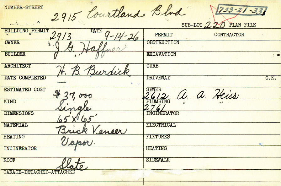 2915 Courtland Boulevard Shaker Heights, OH 44122 PARCEL ID: 733-21-033 Building Permit Date: 09-14-1926 Plan File Number: 92-135 Microfilm Roll: NewRoll#1 Neighborhood: Malvern Owner: Haffner, J. G. Builder: Haffner, J.G. Architect: Burdick, H. B. Estimated Cost: 37000 Kind: Single, Single Residence or Dwelling Material: Brick Veneer Heating: Vapor Roof: Slate |
