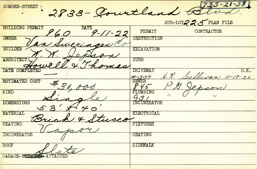 2833 Courtland Boulevard Shaker Heights, OH 44122 PARCEL ID: 733-21-038 Building Permit Date: 09-11-1922 Plan File Number: 0 Neighborhood: Malvern Owner: Van Sweringen Company Builder: Jepson, W. W. Architect: Howell and Thomas Estimated Cost: 30000 Kind: Single, Single Residence or Dwelling Material: Brick and Stucco Heating: Vapor Roof: Slate Garage: attached Card Available: yes |