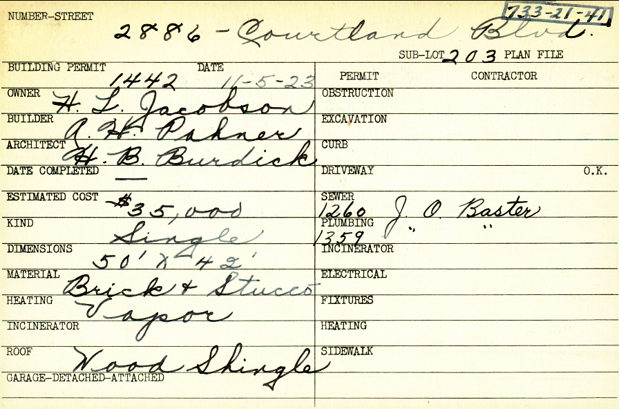2886 Courtland Boulevard Shaker Heights, OH 44122 PARCEL ID: 733-21-041 Building Permit Date: 11-05-1923 Plan File Number: 0 Neighborhood: Malvern Owner: Jacobson, H. L. Builder: Pahner, A. H. Architect: Burdick, H. B. Estimated Cost: 35000 Kind: Single, Single Residence or Dwelling Material: Brick and Stucco Heating: Vapor Roof: Wood Shingle Card Available: yes |