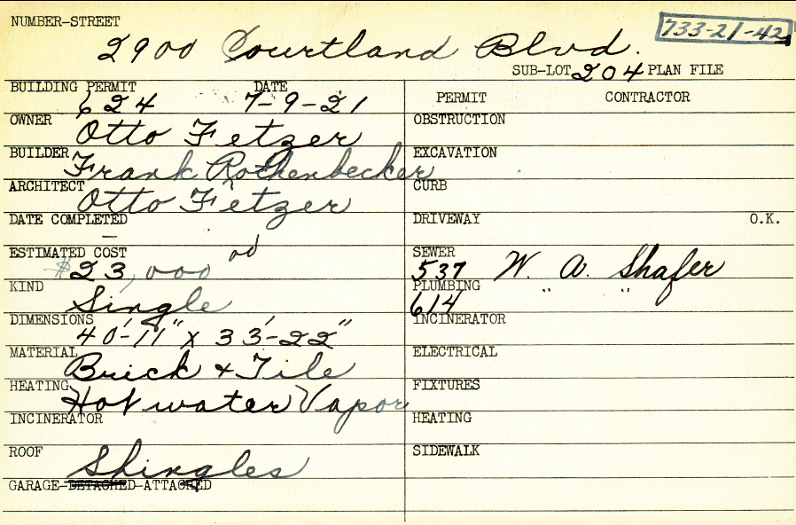 2900 Courtland Boulevard Shaker Heights, OH 44122 PARCEL ID: 733-21-042 Building Permit Date: 07-09-1921 Plan File Number: 813 all scanned Microfilm Roll: Roll011 Neighborhood: Malvern Owner: Fetzer, Otto Builder: Rothenbecke, Frank Architect: Fetzer, Otto Estimated Cost: 23000 Kind: Single, Single Residence or Dwelling Material: Brick and Tile Heating: Hot Water Roof: Shingles Garage: attached |