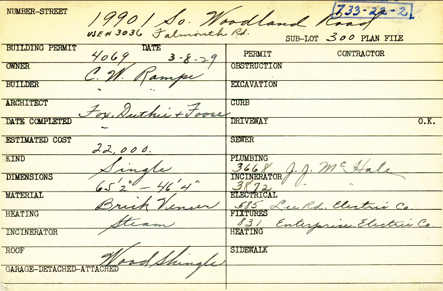 19901 South Woodland Road Shaker Heights, OH 44122 PARCEL ID: 733-22-002 Building Permit Date: 03-08-1929 Neighborhood: Malvern Owner: Rampe, C.W. Builder: Rampe, C.W. Architect: Fox, Duthie and Foose Estimated Cost: 22000 Kind: Single, Single Residence or Dwelling Material: Brick Veneer Heating: Steam Roof: Wood Shingle Card Available: Yes |