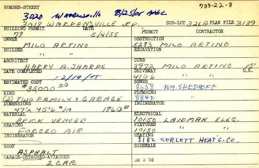 3020 Warrensville Center Road Shaker Heights, OH 44122 PARCEL ID: 733-22-008 Building Permit Date: 05-04-1955 Plan File Number: 3139 Neighborhood: Malvern Owner: Artino, Milo Builder: Artino, Milo Architect: Sharpe, Harry A. Estimated Cost: 35000 Date Completed: 12-19-1955 Kind: Duplex or Two-Family and Garage Material: Brick Veneer Heating: Forced Air Roof: Asphalt Garage: detached 2 car Card Available: yes |