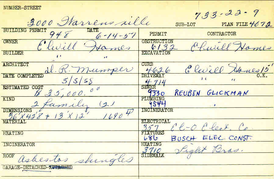 3000 Warrensville Center Road Shaker Heights, OH 44122 PARCEL ID: 733-22-009 Building Permit Date: 06-14-1957 Plan File Number: 4072 Microfilm Roll: Roll#59 Neighborhood: Malvern Owner: Elwill Homes Builder: Elwill Homes Architect: Mumper, Richard D. Estimated Cost: 35000 Date Completed: 05-05-1958 Kind: Duplex or Two-Family Roof: Asbestos Shingles Garage: detached |